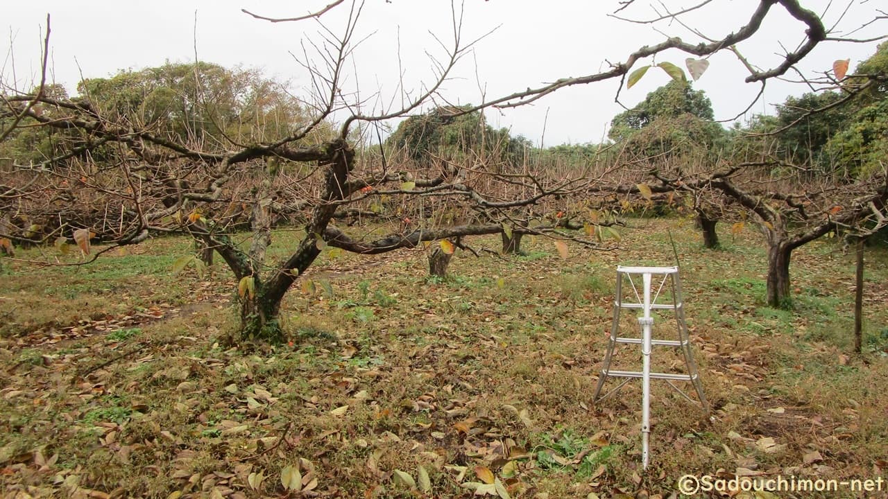 収穫も終わりだいぶ寒くなって、たまに雪が降る12月は柿の木の剪定が主な作業になります。落葉することで柿の木自体が水分をあまり吸い上げなくなり、枝が切りやすい硬さになります。柿の剪定は枝を切ったら、集めて園地の外に持ち出すか、園地内で処理します。冬の時期は自分の園地の剪定と剪定作業を委託している高齢の農家さんの園地に剪定に行ったりします。柿の枝を抑える支柱もこのタイミングで片付けます。