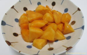 - 温度が下がってタレがしみ込んだので、器によ盛り付けて、かつお節をかけて完成です。