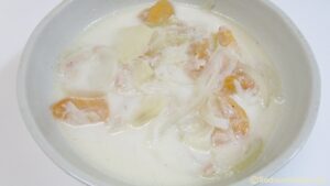 - キャベツと柿を食べやすい大きさに切る。スライスチーズはさいの目切りにする。