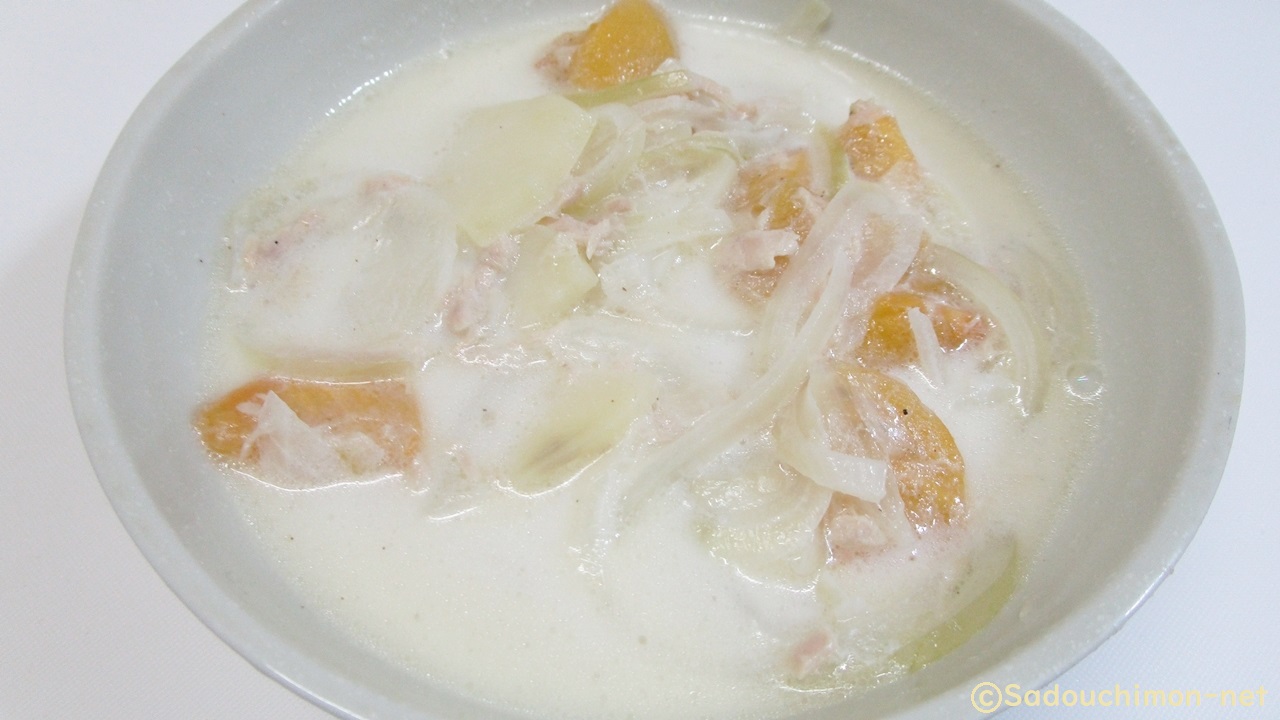簡単シーフードスープ「ツナ缶と牛乳とお好みの具材で」